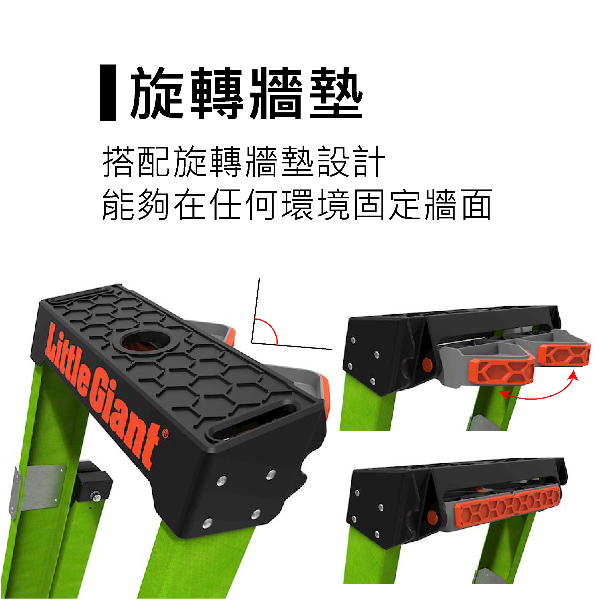4.旋轉牆墊設計 創新頂蓋設計能夠輕鬆地將工作梯固定在內外牆角、牆壁和樑柱上。