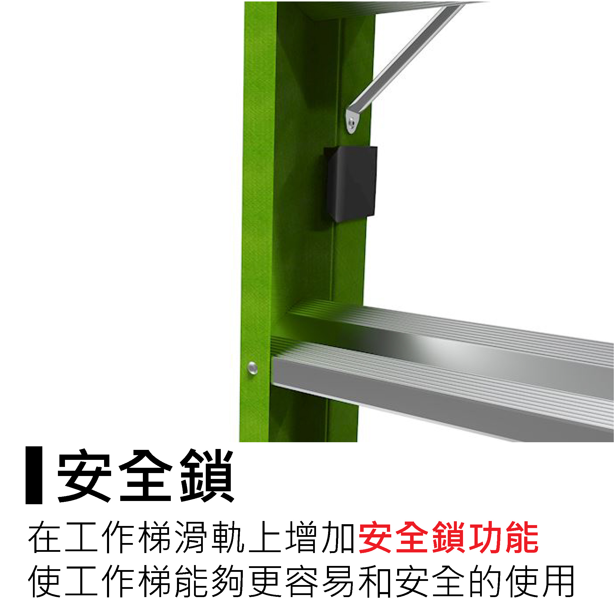 3. 安全固定鎖 在工作梯滑軌上增加安全鎖功能使工作梯能夠更容易和安全的使用。