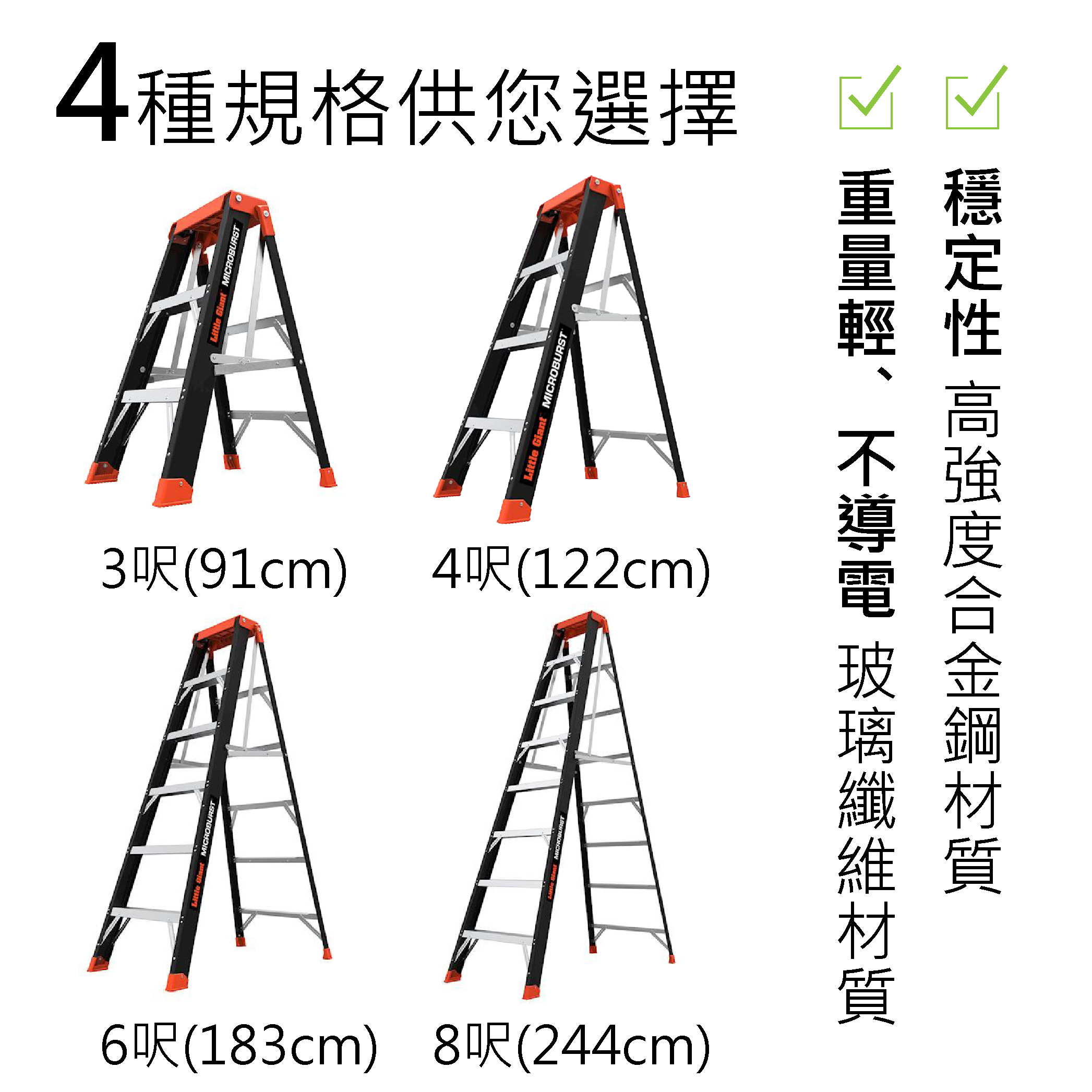 商品名稱:穩固梯寬踏板 8呎 型號:15710-001 材質:玻璃纖維 耐重:136 kg 最大工作高度:172.72 cm 工作梯最大範圍:370.84 cm 收納深度:10 cm 收納寬度:72 cm 收納高度:251.46 cm 重量:15 kg