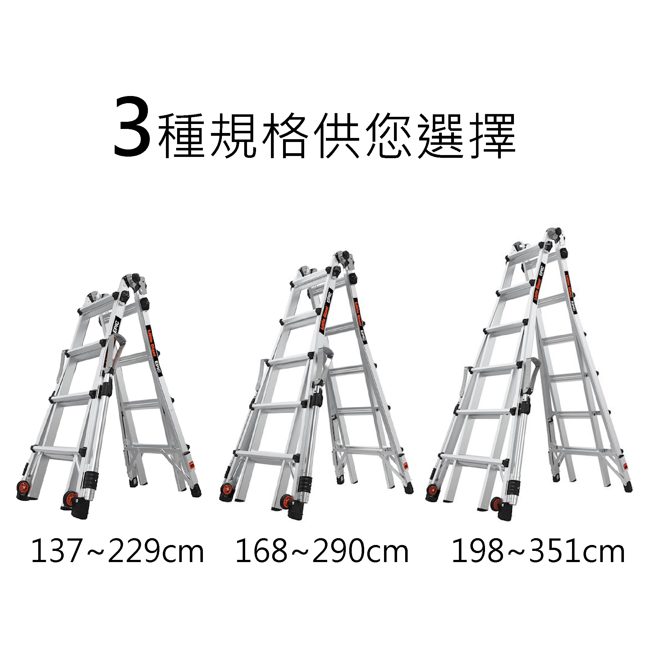 商品名稱:多功能梯含自動腳 5-9呎 M22 型號:16822-818 材質:航空鋁材 耐重:136 kg A字梯最大高度:231.14 cm 一字梯最大高度:472.44 cm 收納深度:23 cm 收納寬度:71 cm 收納高度:170 cm 重量:21 kg 商品名稱:多功能梯含自動腳 6-11呎 M26 型號:16826-818 材質:航空鋁材 耐重:136 kg A字梯最大高度:289.56 cm 一字梯最大高度:589.28 cm 收納深度:23 cm 收納寬度:79 cm 收納高度:201 cm 重量:25.4 kg