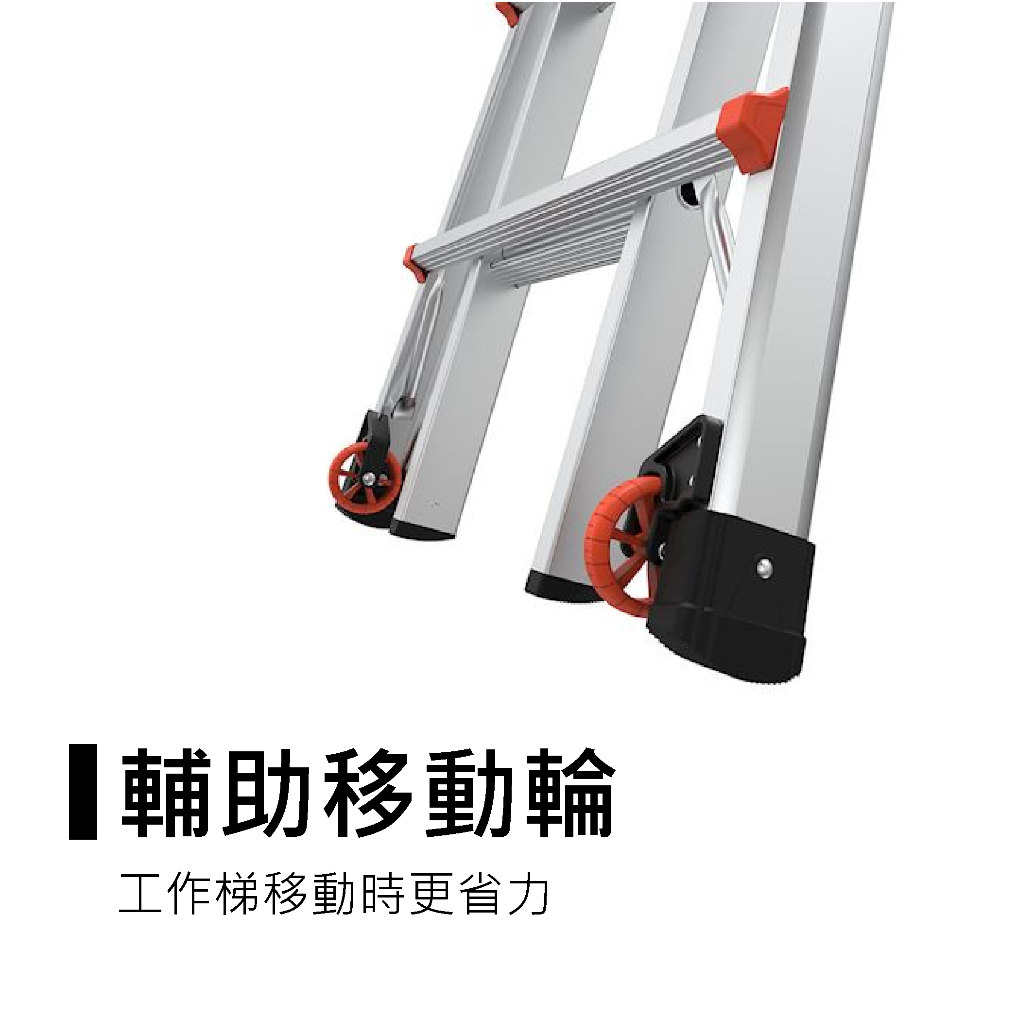 3.輔助輪設計 長時間攜帶工作梯會造成身體上的負擔,當萬用梯搭配輔助輪設計,您能夠輕鬆和更快的速度將工作梯移動到目的地