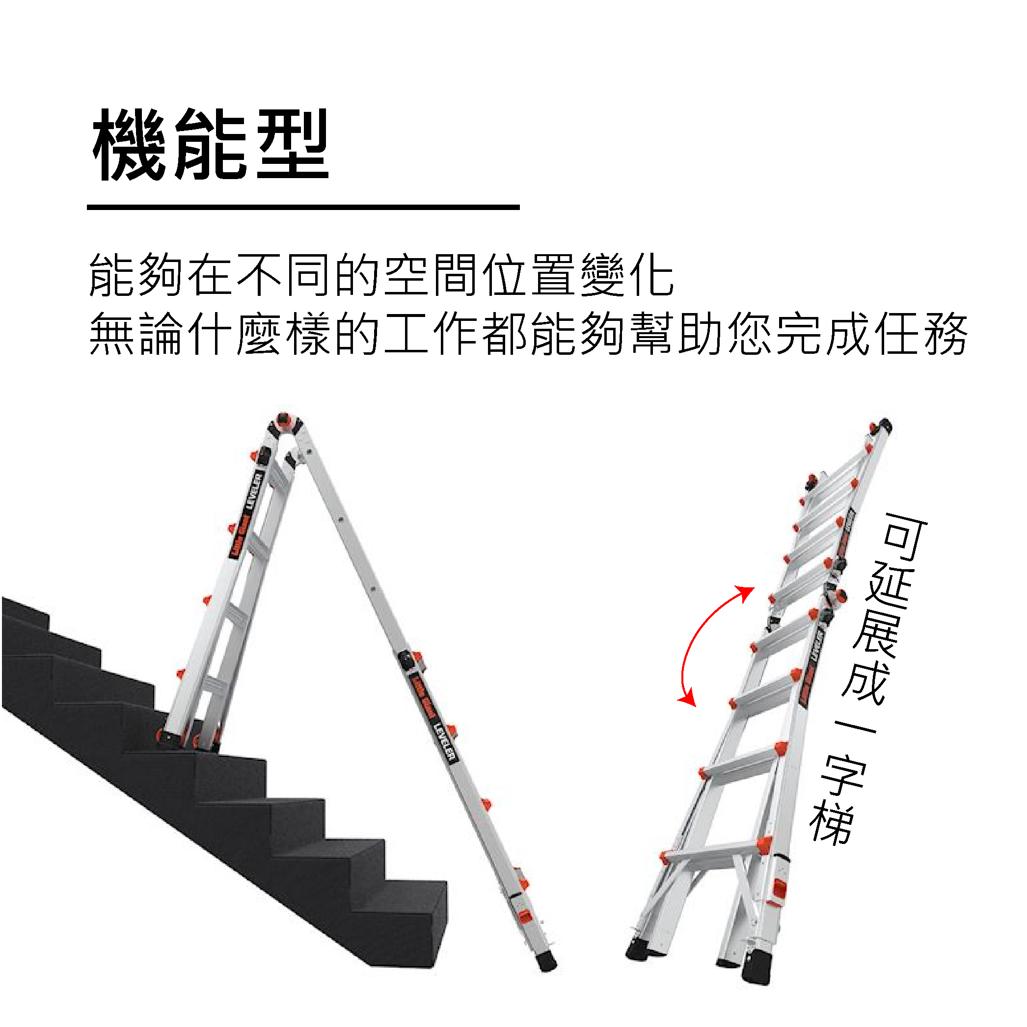 2.多功能配置 如果你只能攜帶一個工作梯? 那麼您還會想要攜帶多種類型的工作梯嗎? 萬用梯是一款結合多功能的工作梯,可以透過安全固定鎖將工作梯調整為A字梯、延伸梯、直梯和90度角工作梯或者搭配外接式平台增加工作空間。延伸裝置安全鎖能夠讓工作人員能夠更加快速調整所需要的高度,以提高效率完成任務。
