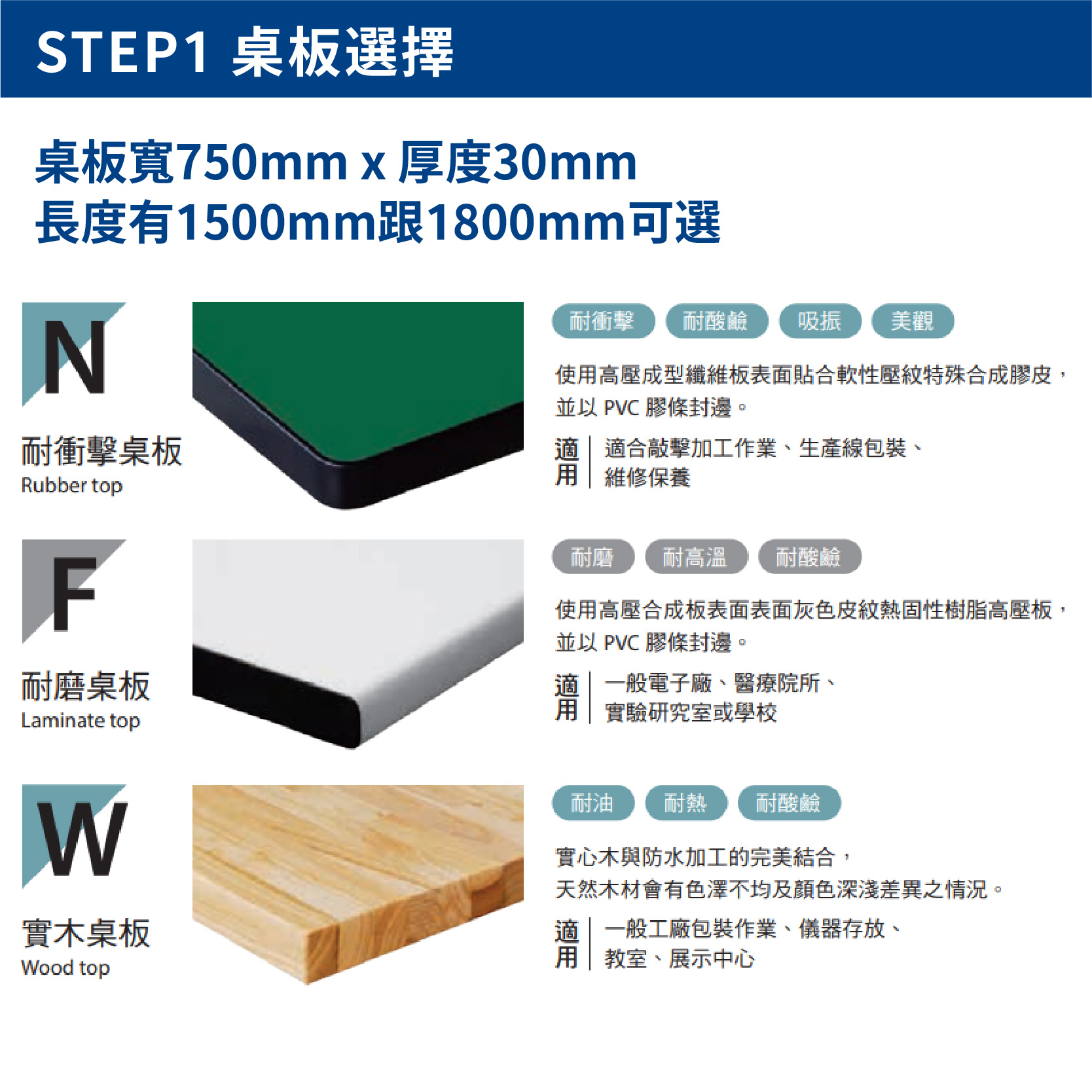 -F耐磨桌板使用高壓合成板,表面粘貼灰色皮紋面熱固性樹脂高壓板,側邊並以PVC長型膠條封邊,加倍保護桌邊不易受損。
