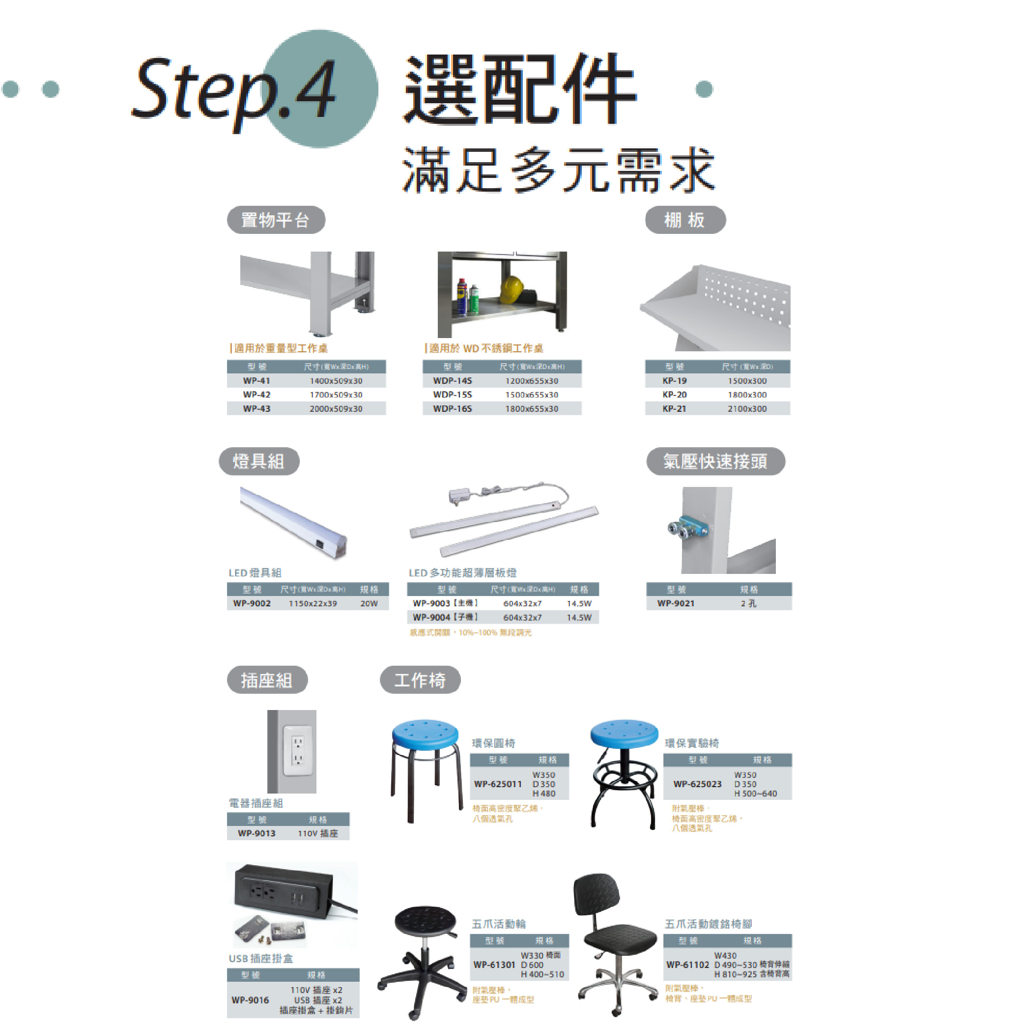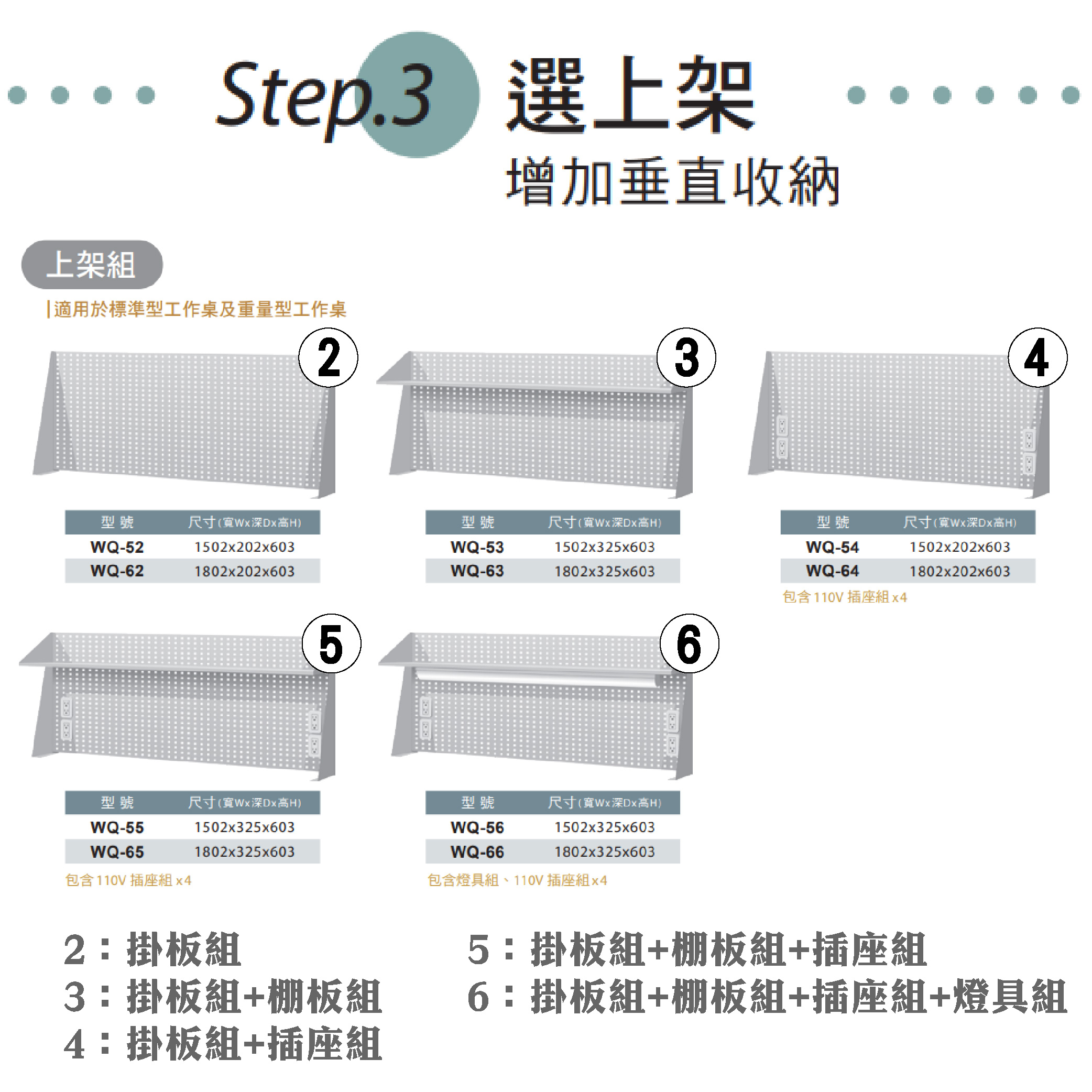 2:掛板組 3:掛板組+棚板組 4:掛板組+插座組 5:掛板組+棚板組+插座組 6:掛板組+棚板組+插座組+燈具組