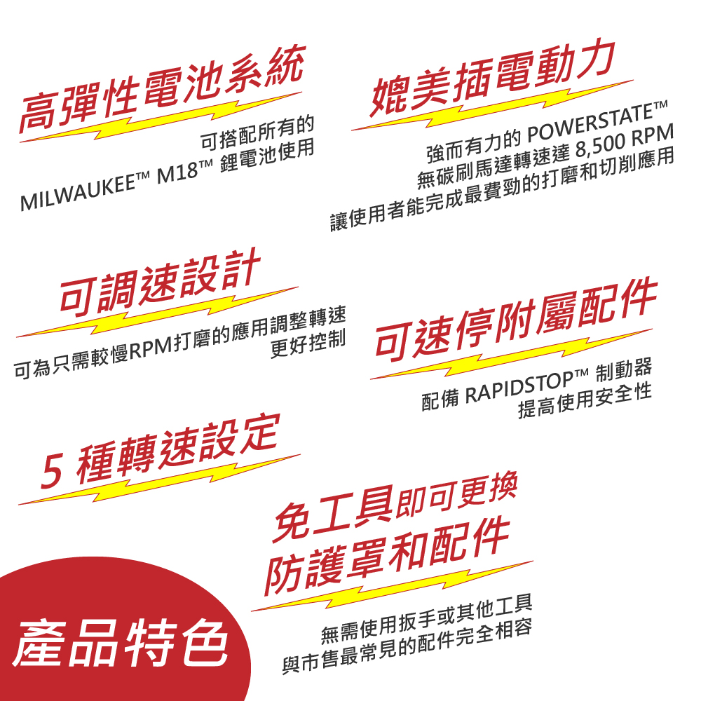 *高彈性電池系統:可搭配所有的MILWAUKEE™ M18™ 鋰電池使用