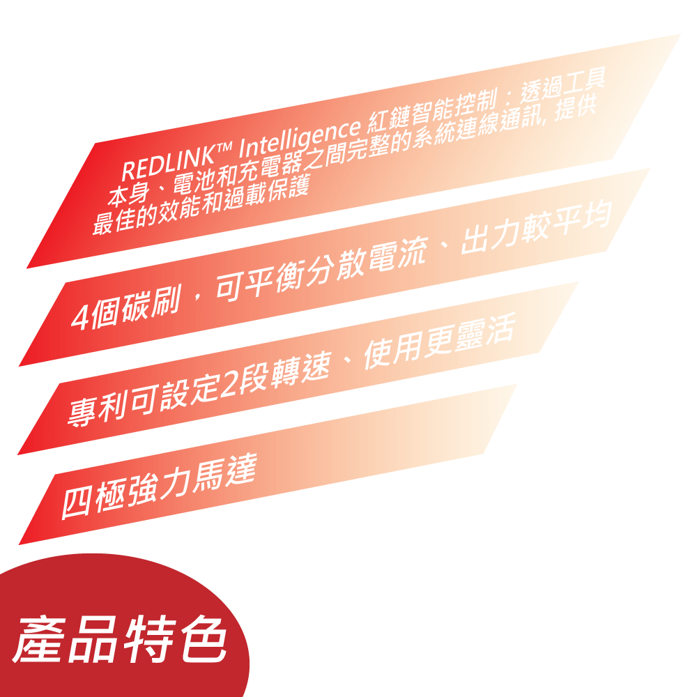 *REDLINK™ Intelligence 紅鏈智能控制:透過工具本身、電池和充電器之間完整的系統連線通訊, 提供最佳的效能和過載保護
