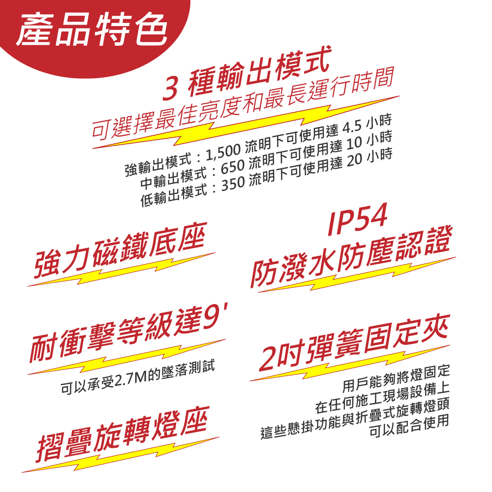 *摺疊旋轉燈座 *耐衝擊等級達 9' *IP54:防潑水防塵認證