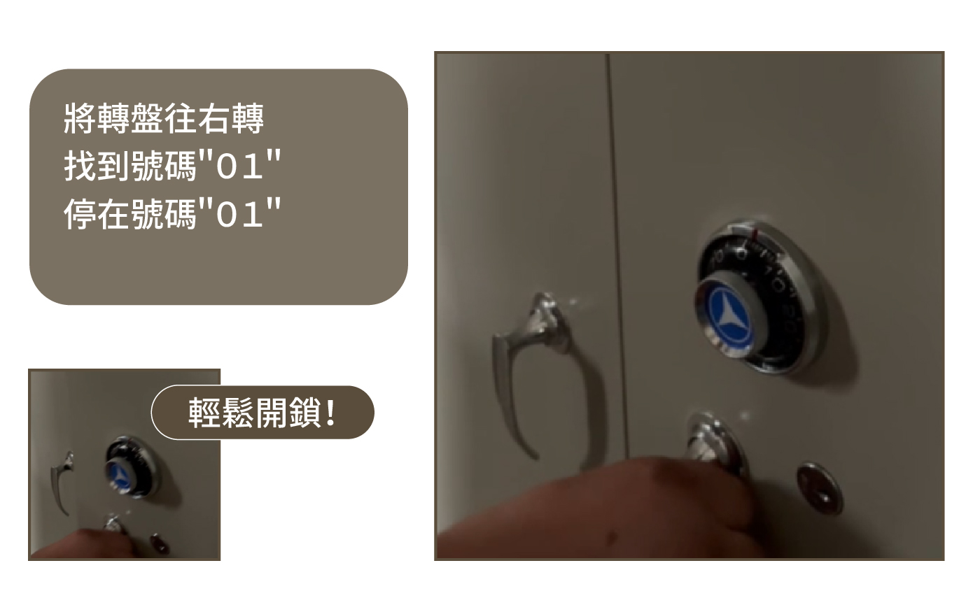 將轉盤往右轉找到號碼"01",對準號碼"01"後定格,便能輕鬆開鎖